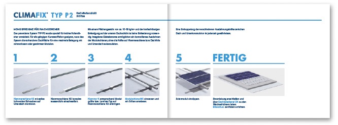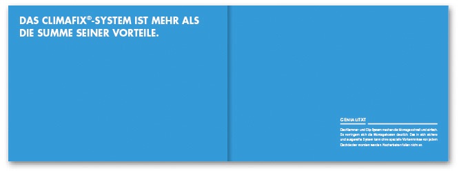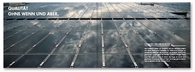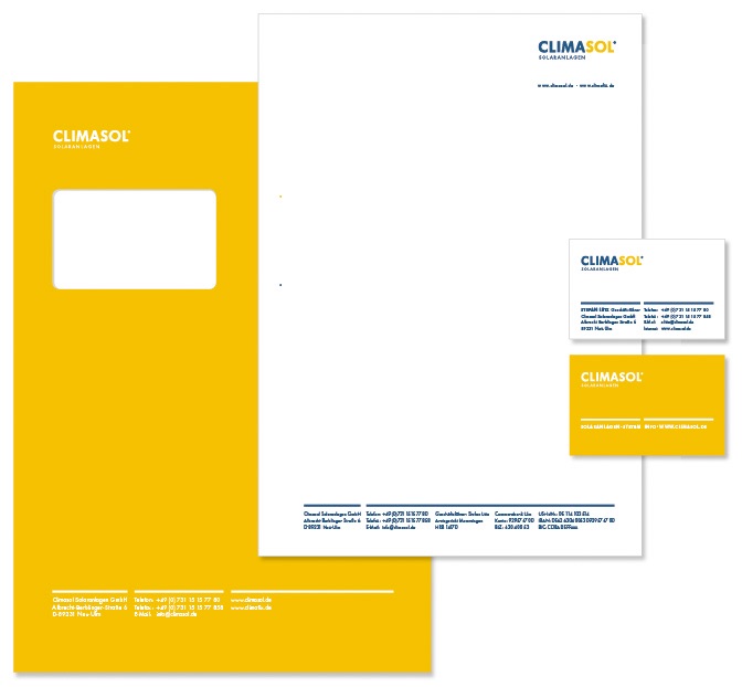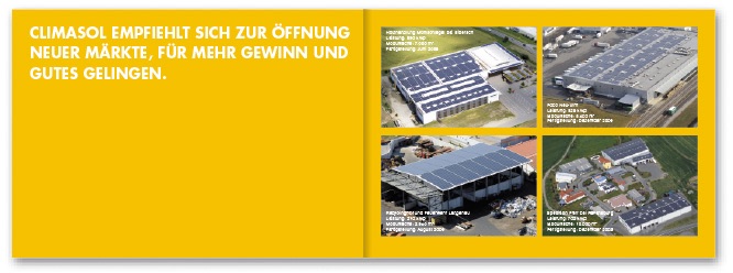 Das Unternehmen projektiert, errichtet und betreut große Solaranlagen auf Flachdächern. Mit der innovativen und patentierten Unterkonstruktion »Climafix«, die durch einfache Montage und höchste Qualität besticht, hat »Climasol« den entscheidenden Wettbewerbsvorteil. Für Climasol haben wir neue Wortmarken, die Geschäftsausstattung, die Produktbroschüre, Montageanleitungen, Produktblätter und ein Orientierungssystem entwickelt.