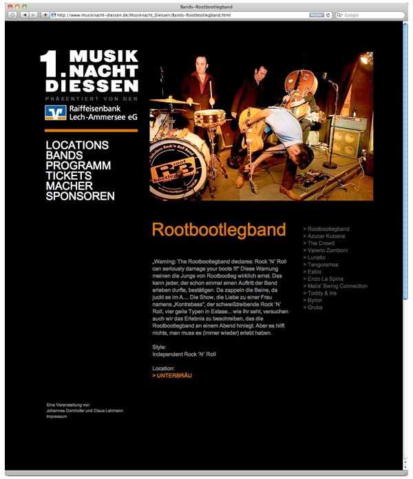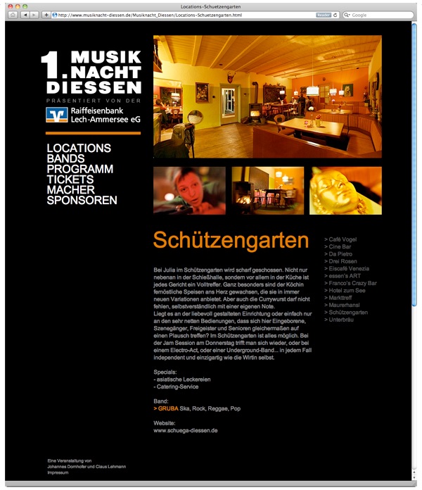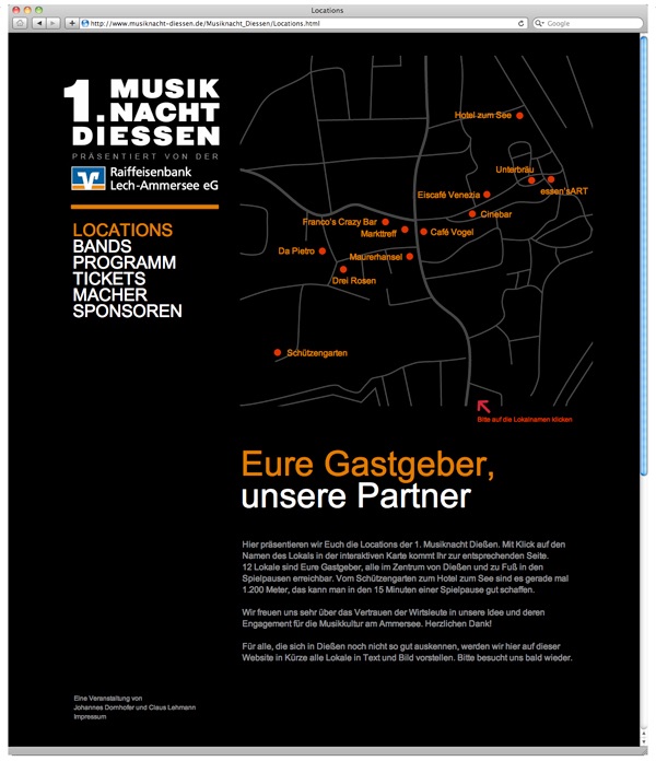 Was in vielen anderen Städten eine längst etablierte Veranstaltung geworden ist, haben die Agentur SEC von Johannes Dornhofer und Grafiker/Musiker Claus Lehmann heuer für den Markt Diessen am Ammersee auf die Beine gestellt. 12 Live-Bands in 12 Lokalen, und das alles mit einem Ticket zu besuchen...